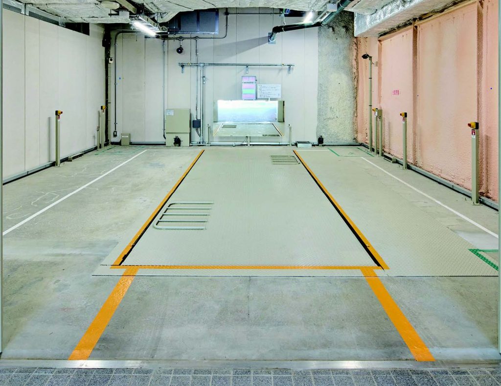 2層構造でリフトに旋回装置を内蔵し180度旋回させ前進による入出庫に対応、スムーズな入出庫を実現。加えて、駐車設備が地下に収められていることで、地上部はプロムナードの緑や街の景観を妨げることなく、開放的で上質な空間が保たれています。