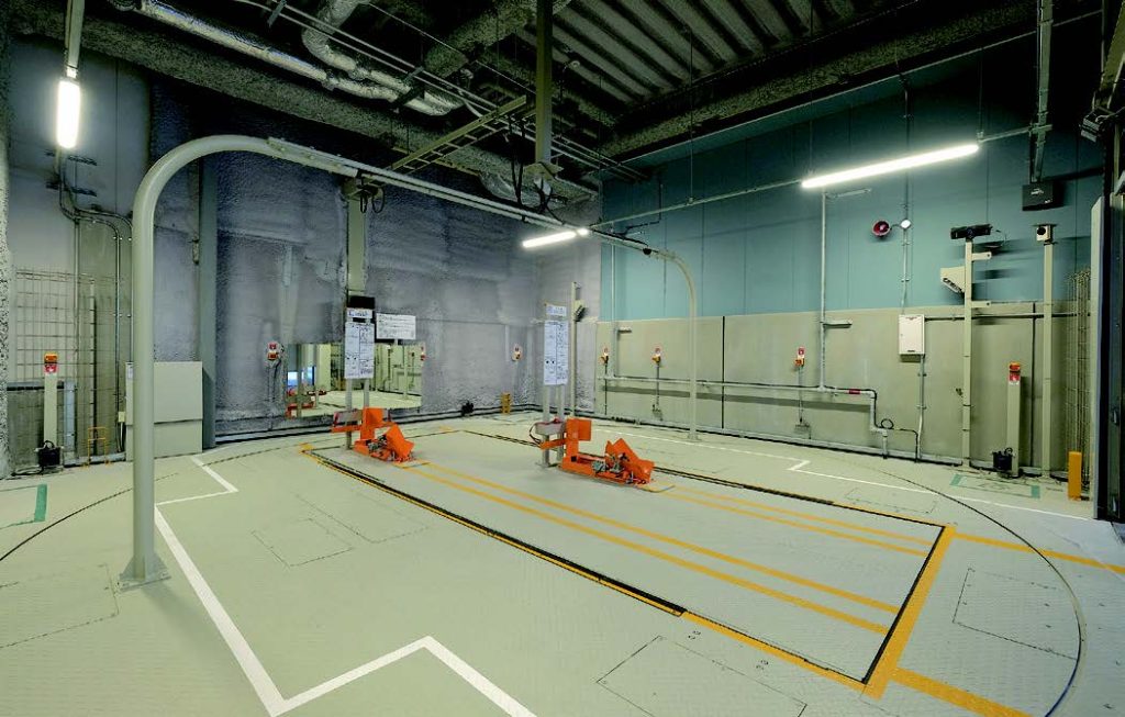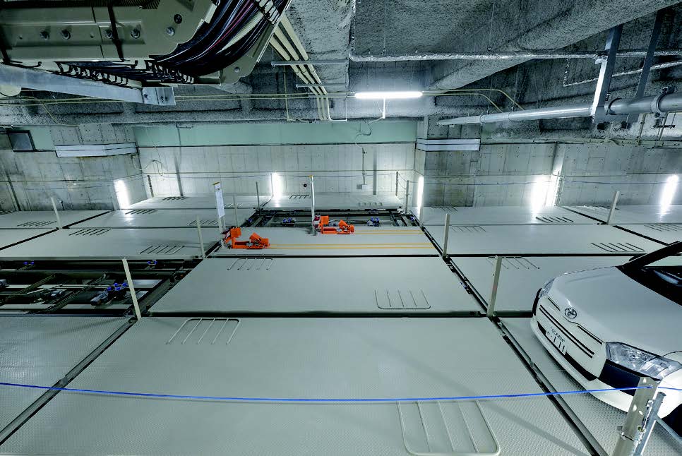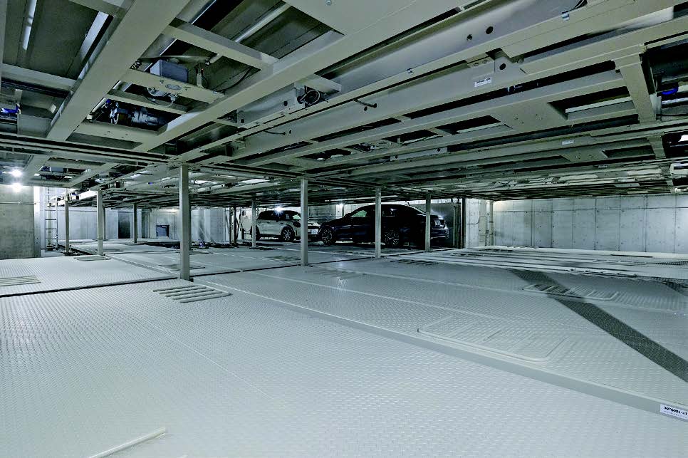 2層構造に加え、ターンテーブルを内蔵し90度旋回機能を備え、車両の入出庫に対応。幅広のオートドア(3,900W×2、145H)を採用し、利用者の入出庫に配慮されています。
